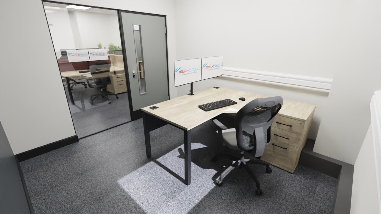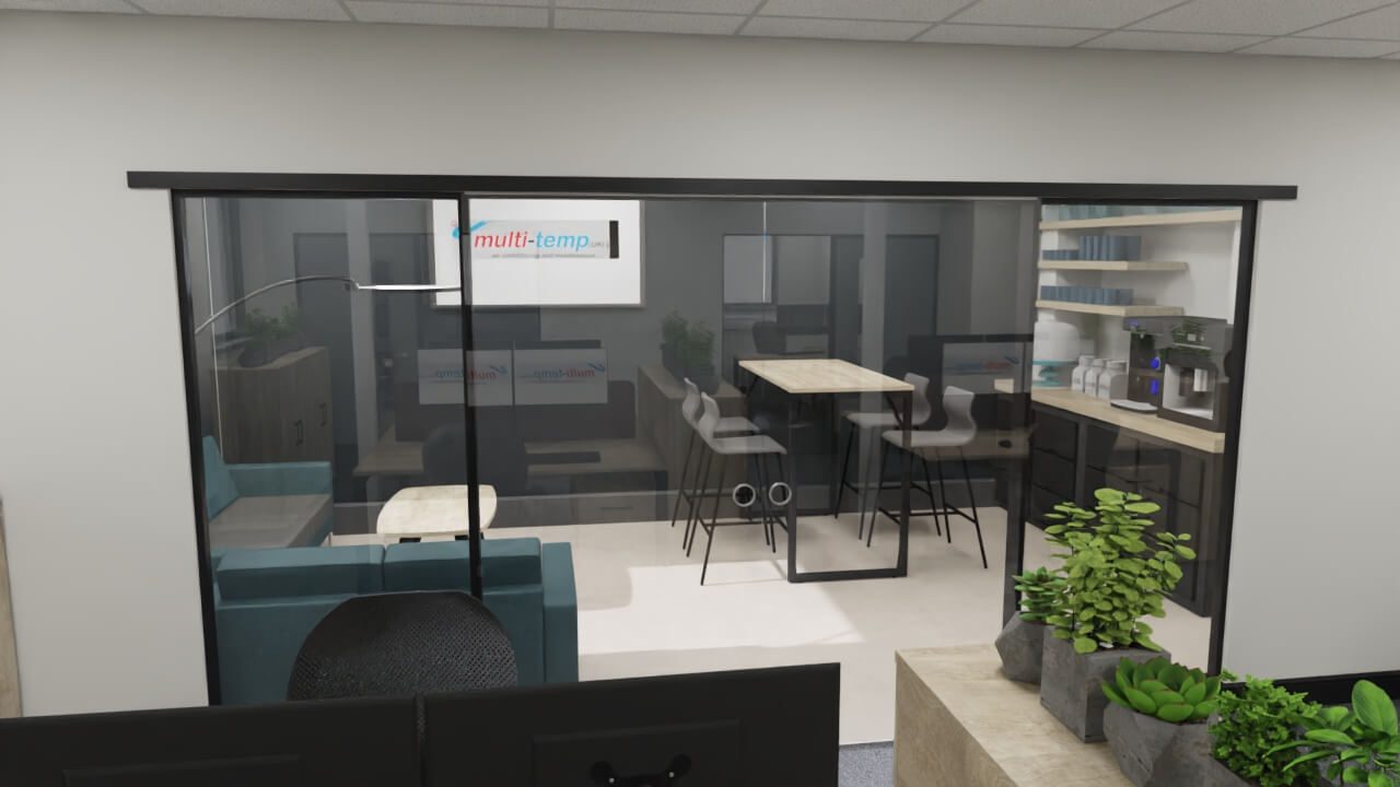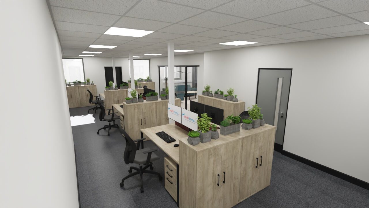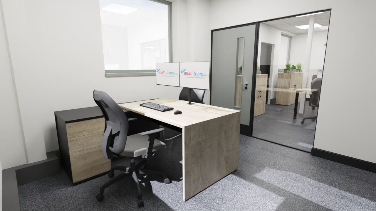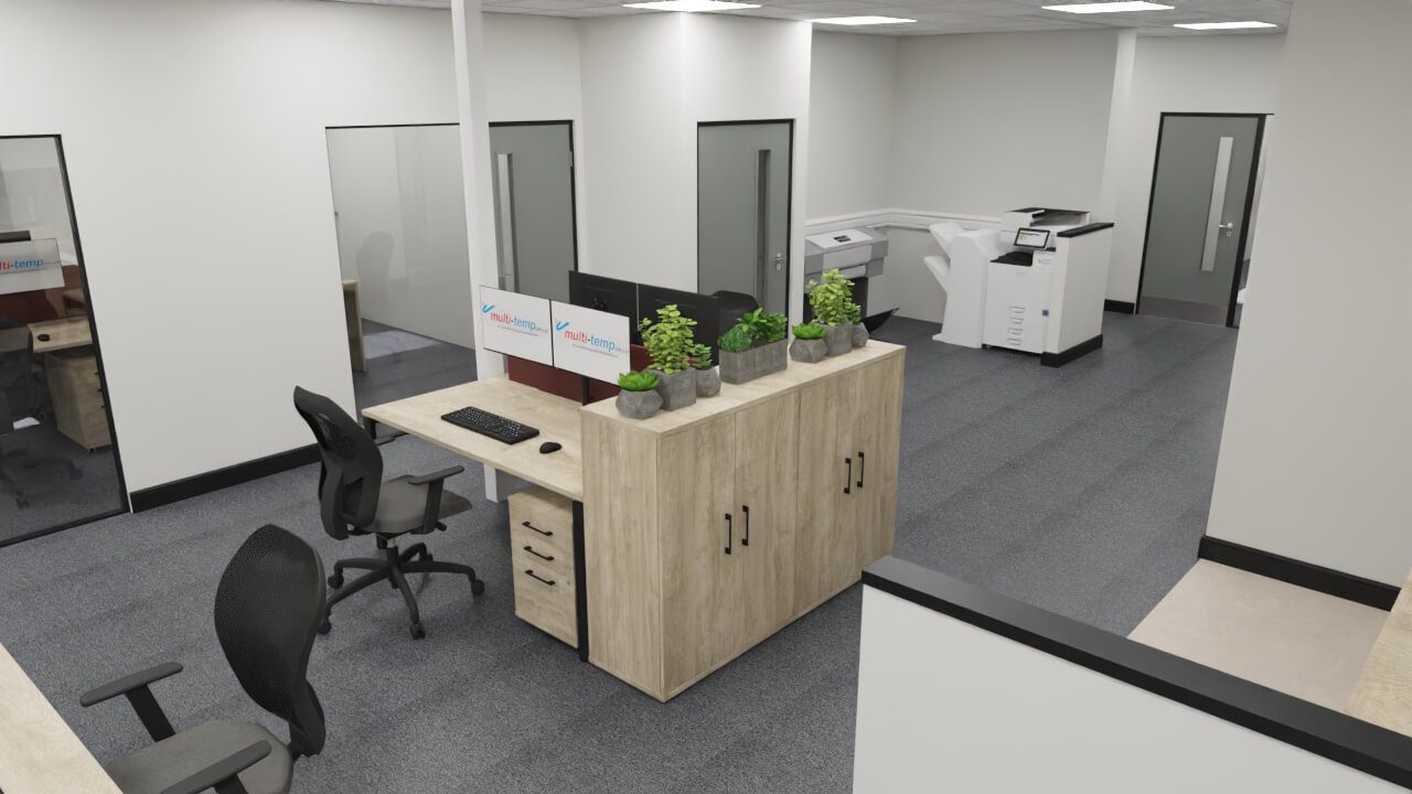 Multi-Temp UK recently got in touch having been recommended for our expertise in office design. They sought our assistance in developing office furniture space plans that would comfortably accommodate 23 staff, along with creative interior design solution aimed at creating a modern, comfortable environment that would inspire their loyal team to relocate and impress customers and suppliers alike.